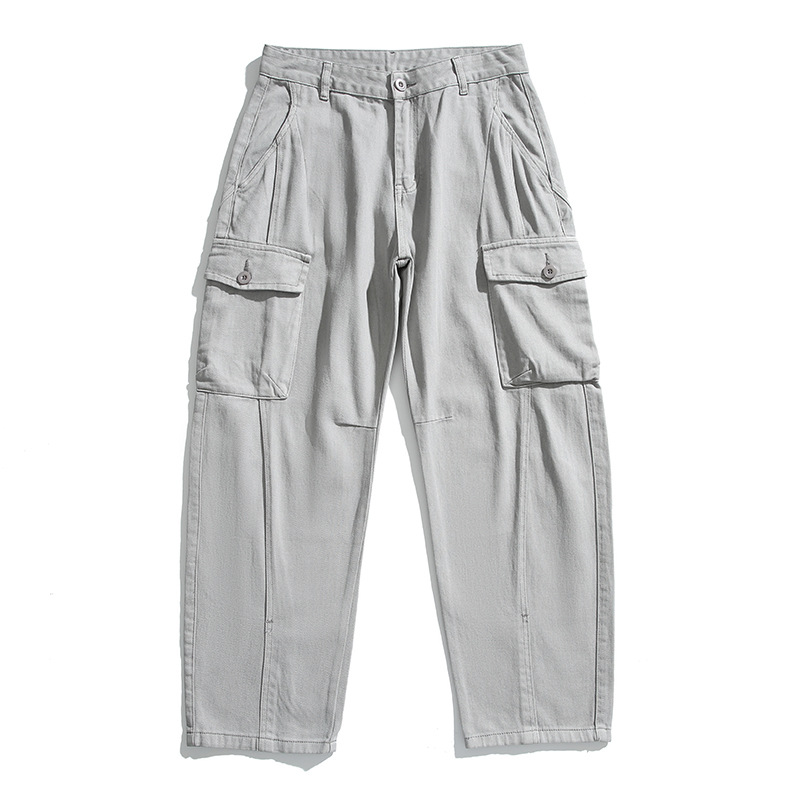 Small MOQ Apparel Factory Washed Denim Straight-leg Cargo Pants with Multiple Pockets for Men