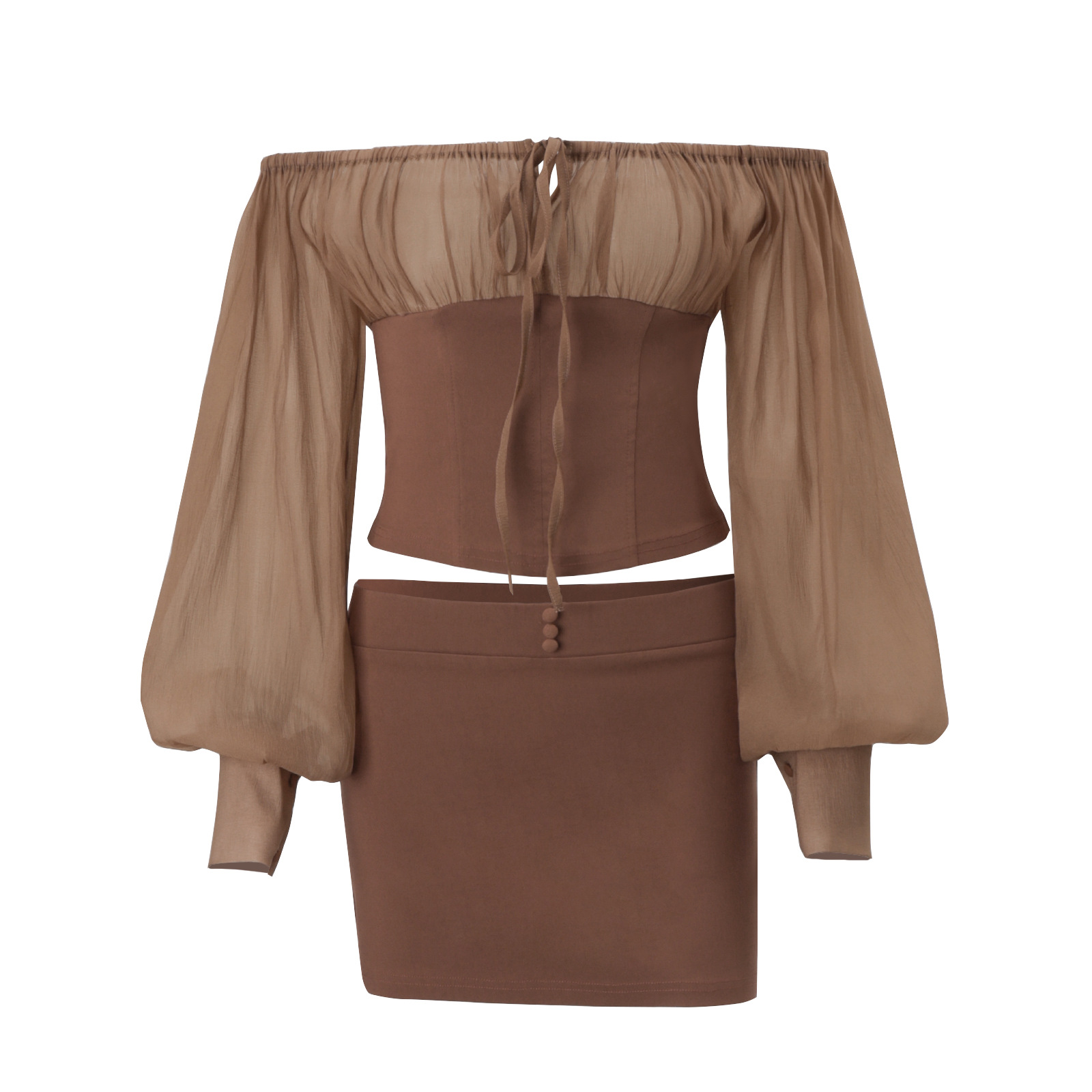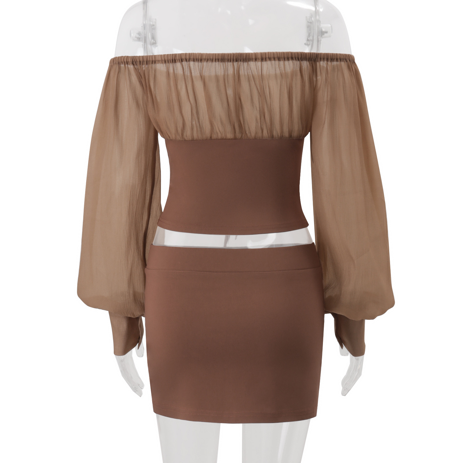 Apparel Custom Supplier One-shoulder Mesh Long-sleeved Top with Hip-wrapped Short Skirt Suit for Women